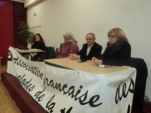 Étaient présents: une responsable aux affaires sanitaires de la mairie de Brest, le docteur Gerard Bapt qui a été longuement applaudi, c’est vrai qu’il était le premier et peut-être dernier député à soutenir Irène Frachon dans son combat contre le médiator, un homme de conviction mais avant tout médecin cardiologue . Avec le docteur Guillet, ils ont toujours répondu présent aux malades….Des abbés Pierre de la médecine, des perles rares par les temps qui courent. Ainsi que: Catherine Noël, angiologue à Rennes à nos côtés, Nathalie Geoury, membre de l’AFMT et porte parole pour la Bretagne, Martine Arz pour le «collectif levo nouvelle formule Breizh».