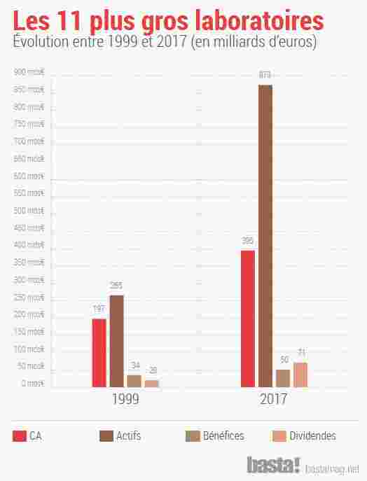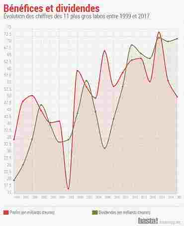 Entre 1999 et 2017, le chiffre d’affaires de ces onze laboratoires a été multiplié par deux, pour atteindre la somme record de 395 milliards d’euros en 2017 ! Parallèlement, la valeur de leurs actifs – tout ce que l’entreprise possède, de la valeur d’un brevet au patrimoine immobilier, en passant par ses placements financiers – a été multipliée par 3,3 pour atteindre 873 milliards d’euros (un chiffre toutefois en repli par rapport au record de 2016 : 988 milliards). Les dividendes et rachats d’actions – autrement dit la part des profits directement redistribués aux actionnaires – ont été multipliés par 3,6 pour atteindre 71,5 milliards d’euros en 2017 – alors que les bénéfices nets n’ont augmenté « que » de 44 % sur la même période.