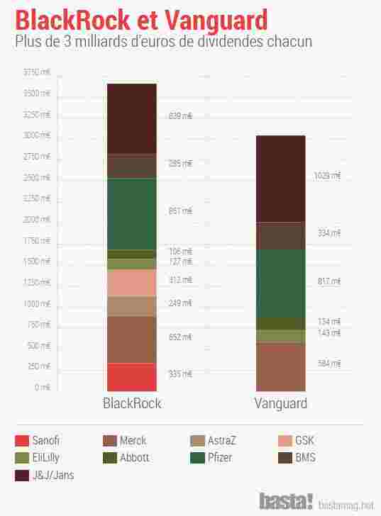 S’il est une industrie qui illustre l’emprise croissante des marchés financiers, c’est donc bien celle du médicament. Son actionnariat est d’ailleurs largement dominé par les grands gestionnaires de fonds de Wall Street (à quelques exceptions près comme la participation de L’Oréal, et donc de la famille Bettencourt, au capital de Sanofi) : ces « investisseurs institutionnels » sans visage qui imposent aux entreprises la loi d’airain du cours en bourse. BlackRock possède ainsi 5,7 % du capital de Sanofi, 8 % de celui d’AstraZeneca, 7 % de celui de GlaxoSmithKline, 7,6 % de Pfizer, 6,2 % de Johnson & Johnson, 6,8 % de Merck/MSD, 6,3 % d’Abbott, 6,4 % de Bristol Meyers Squibb, 5,8 % d’Eli Lilly. Ce qui correspond à 3,66 milliards d’euros de dividendes en 2017. D’autres fonds d’investissement comme Vanguard sont très présents au capital des géants pharmaceutiques, et en retirent eux aussi chaque année des milliards de dollars [4].