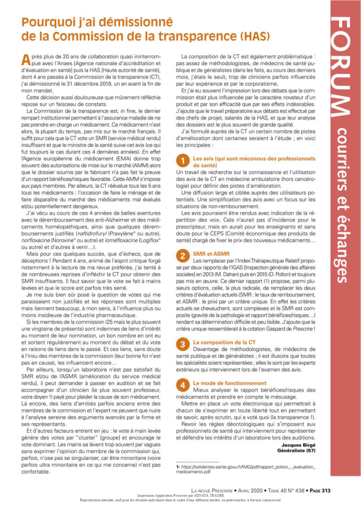 Avec l’aimable autorisation de la revue Prescrire, nous reproduisons ici le témoignage de Jacques Birgé, médecin généraliste et membre du Formindep, sur son expérience au sein de la commission de transparence de la Haute Autorité de Santé (HAS), et les raisons de son départ.