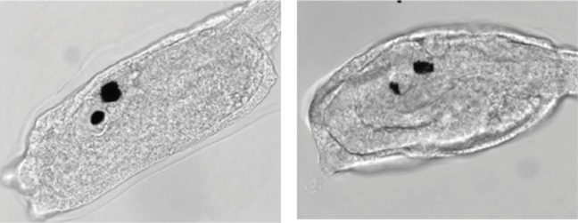 Deux larves d’ascidie montrant les cellules sensorielles du cerveau qui sont pigmentées alors que l’embryon est très transparent. On peut voir dans la larve traitée au bisphénol A, à droite, que les cellules sensorielles pigmentées sont réduites et que leurs positions dans le cerveau sont affectées © R. Dumollard et I. Gomes
