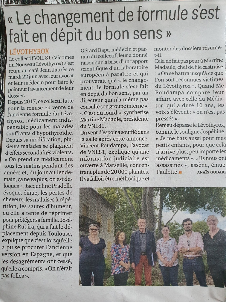 Le docteur Bapt a été soutenir les Tarnais 25 juin 2021 Articles relatifs:Nouveau Levothyrox : des patients tarnais vivent un…Le début de l’ouragan LevothyroxAG 2019 à ChampagnoleUn mois d’octobre bien chargé et prometteur...Quelques images de l'AG 2018Lévothyrox : le collectif des victimes du Tarn…